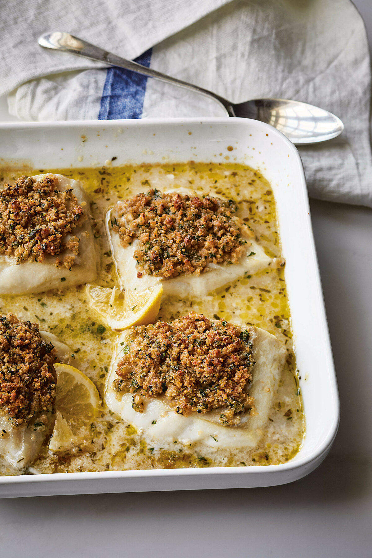 Flaky cod fillets are cooked in white wine and fresh lemon juice, then topped with crunchy crackers, parsley, panko crumbs, garlic, and lemon zest. I bet you never thought I’d be cooking with Ritz Crackers! (If you don’t love cod, you can substitute center-cut halibut!)