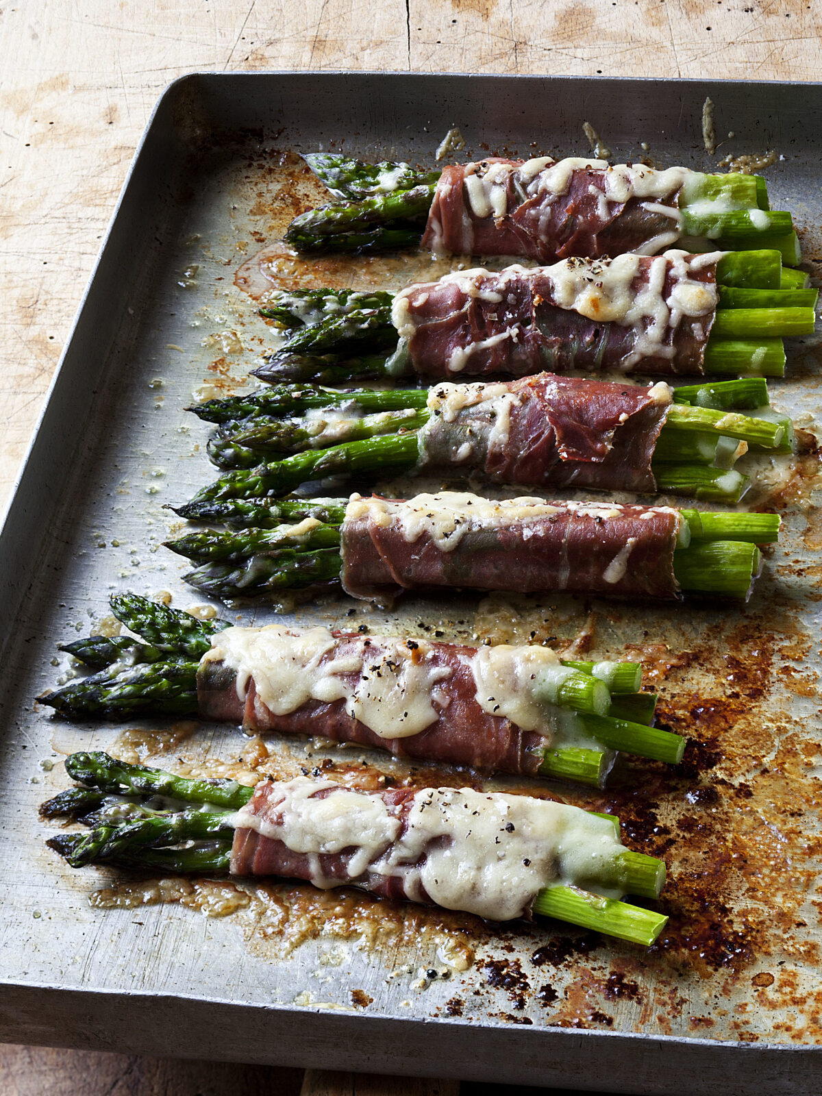 One of the first signs of spring (besides daffodils!) is fresh asparagus. And just like fresh flowers, the best way to store asparagus when you get home from the store is to snip off the ends and stand them upright in a container of water in the fridge. Of course, you can simply drizzle the stalks with olive oil, sprinkle them with salt and pepper and roast them at 400 degrees for 15 to 20 minutes. But when I have guests, I like to make something more special, like these Asparagus & Prosciutto Bundles. They look so elegant but they’re incredibly easy to make and you can assemble them in advance. The crispy prosciutto and melted Gruyere are great with the earthy asparagus, and a little bit of white truffle butter drizzled on top doesn’t hurt, either!! Your friends will never want to eat plain asparagus again!