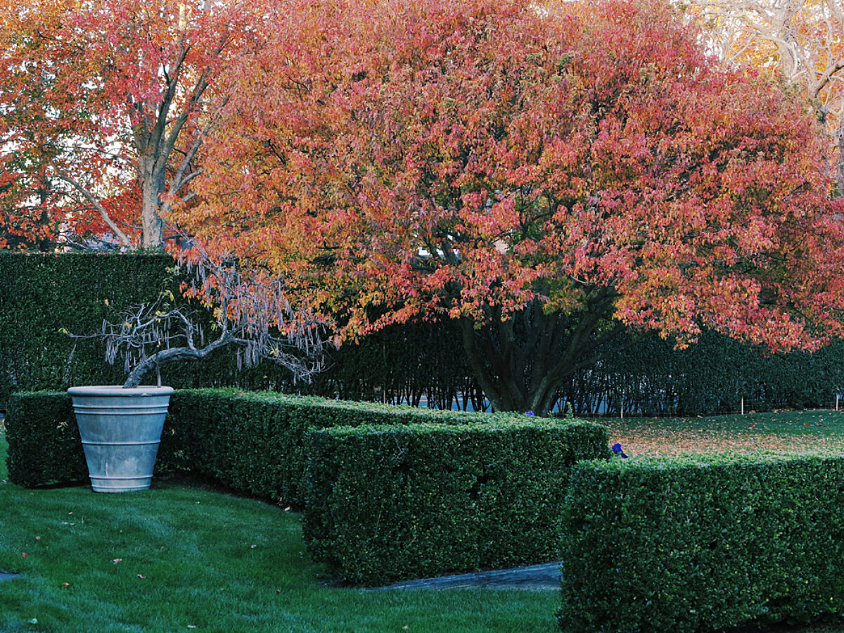 I know everyone associates the Hamptons with summertime, but my favorite season here is actually autumn. We may put most of the garden to bed for the winter but there are still so many plants and trees- like this maple tree- that have beautiful colors in the fall. I particularly love the contrasting textures of the hard-edged ilex hedge, the rough concrete pot with the gnarled standard wisteria branches, and the lacy gorgeousness of that maple tree. They’re all very common things you can find a garden but they put on such a show for us every year!
