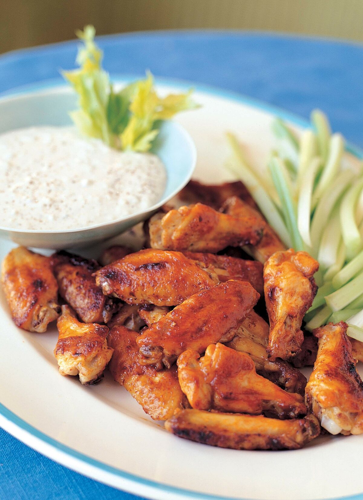 What’s more classic for Super Bowl Sunday than a big platter of hot spicy Buffalo Chicken Wings with blue cheese dip?? Instead of the mess of deep frying, these wings are broiled with butter, cayenne pepper, and Frank’s Hot Sauce. The dip is cool and creamy with lots of tangy blue cheese and sour cream. All you need is a big tub filled with ice cold beer and you’ve got a party!