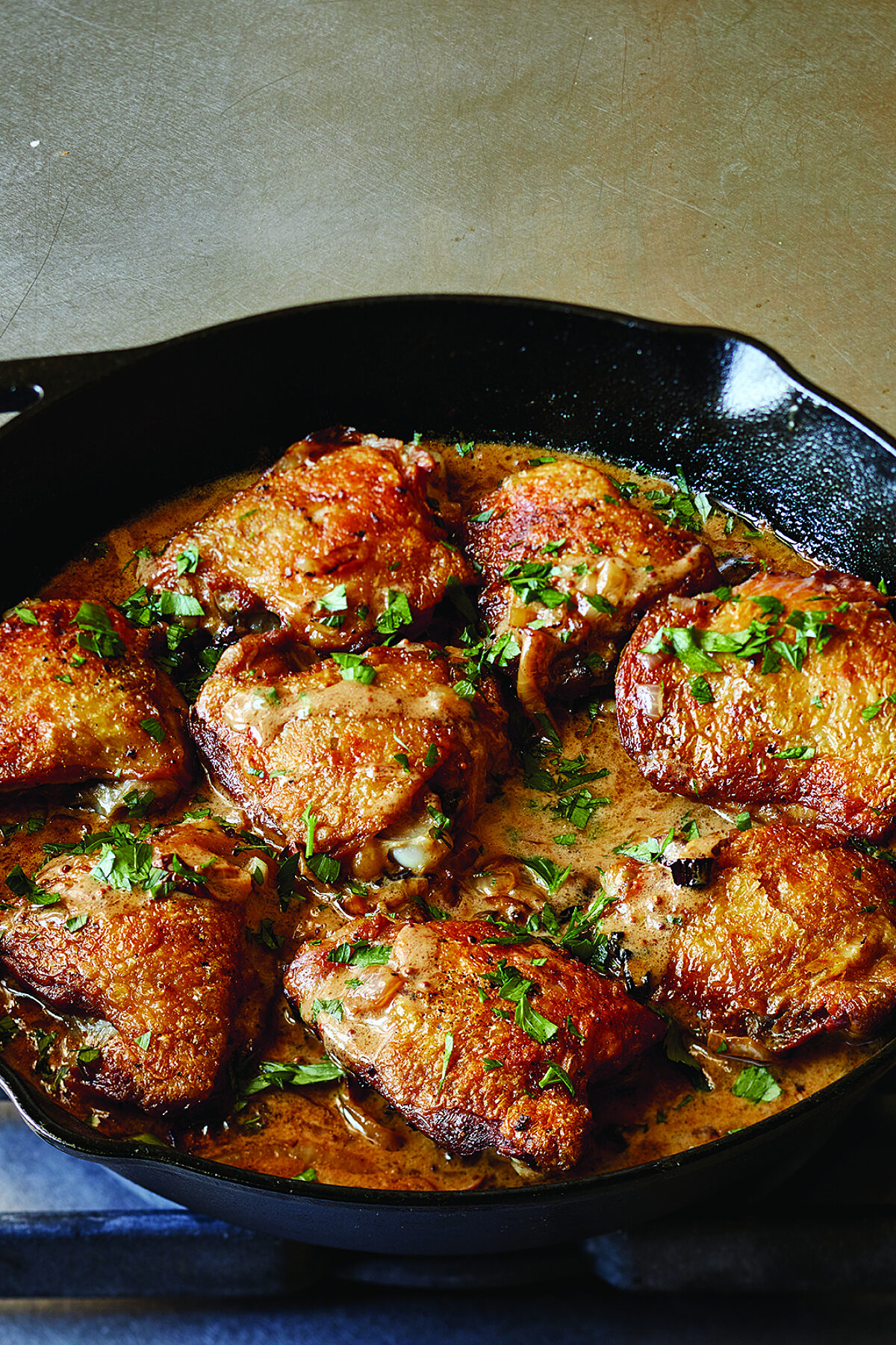 Now that it’s September and everyone is back to school and back to work, couldn’t we all use a new foolproof weeknight dinner? My recipe for Chicken Thighs with Creamy Mustard Sauce might just do the trick. I sear chicken thighs in a cast iron skillet and then set them aside to rest while I make a quick mustard sauce right in the skillet with the delicious juices from the chicken. Dinner is on the table in a half hour - you just need a green salad and bread to mop up the sauce!