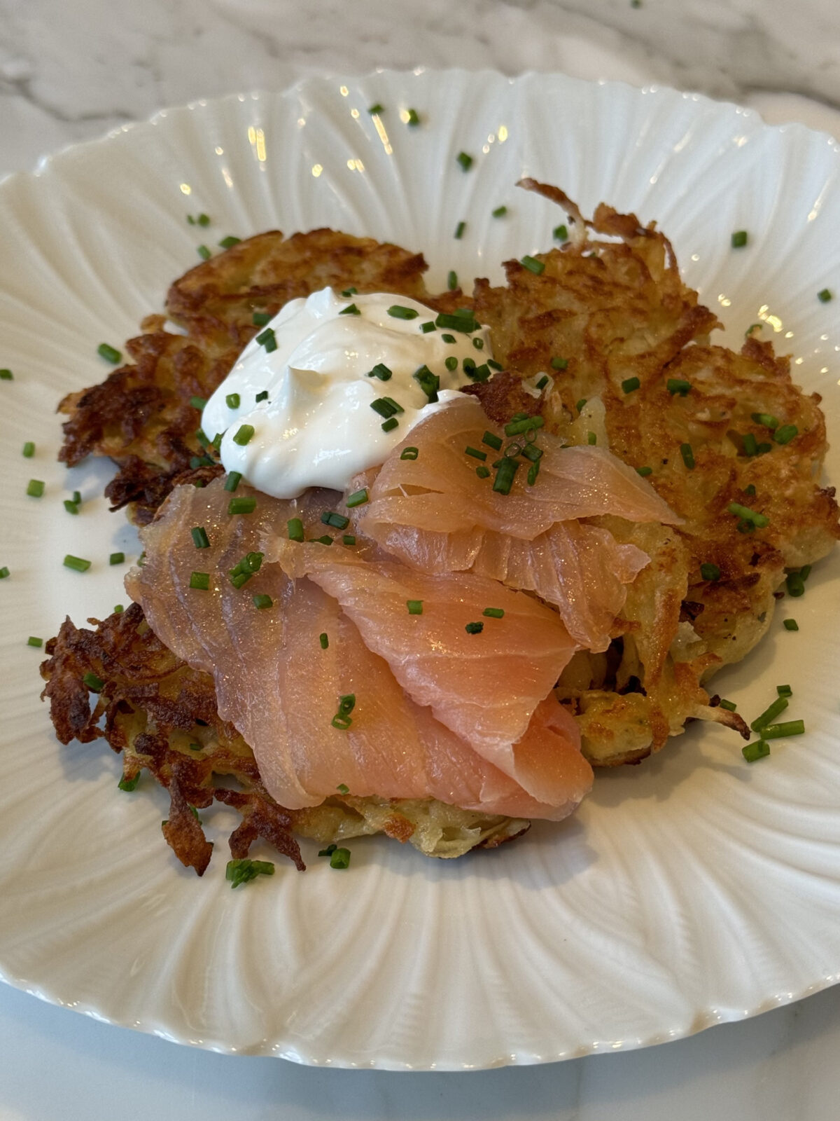 My favorite Sunday lunch during Chanukah - crispy Potato Pancakes with smoked salmon, sour cream, and chives. You don't even have to be Jewish to love it!