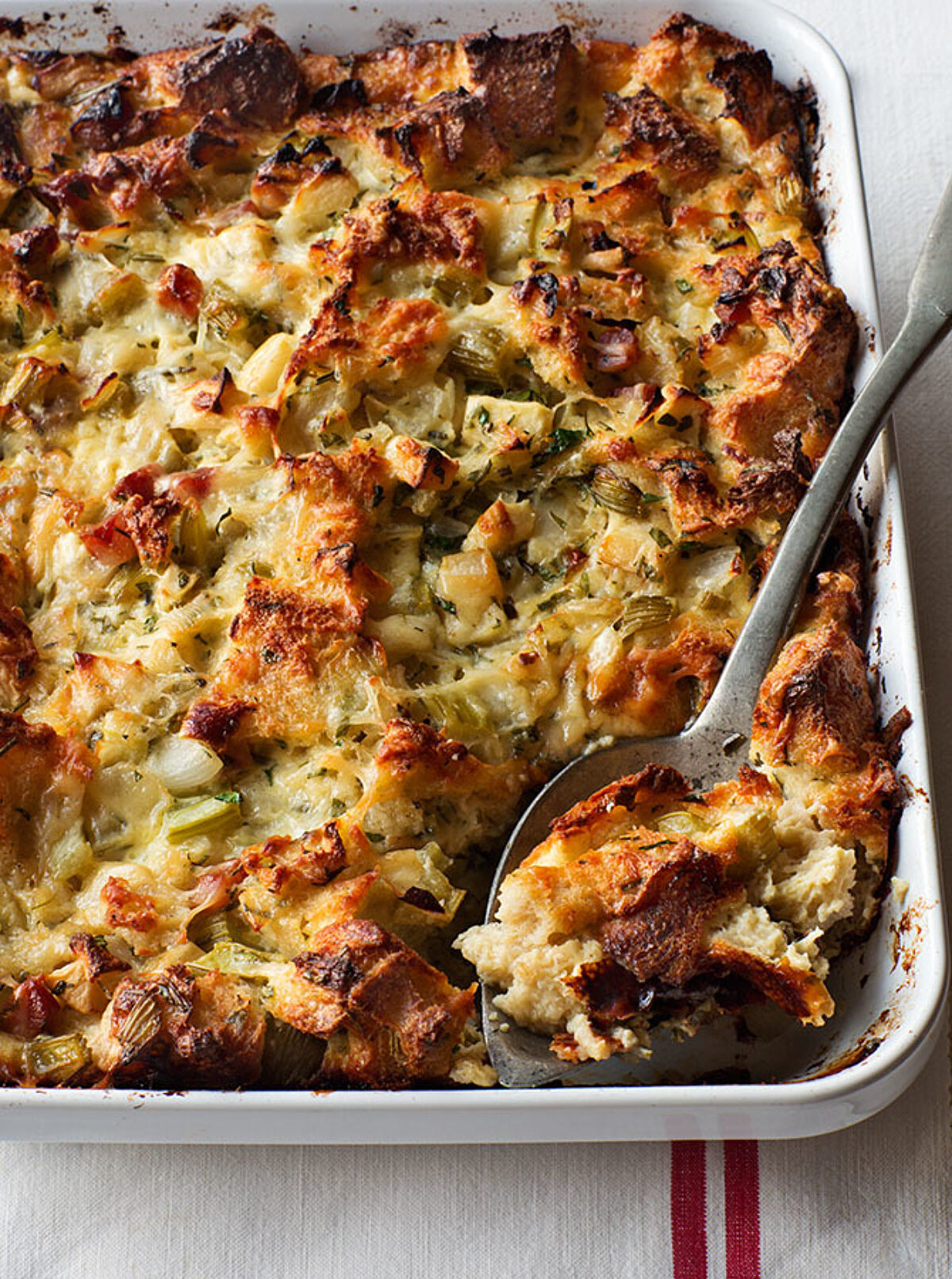 While it might be traditional to cook Thanksgiving stuffing inside the turkey, I prefer to make a savory bread pudding that roasts alongside the turkey instead. The turkey roasts more quickly and the stuffing comes out crunchy on top and moist inside. My Herb & Apple Bread Pudding has all of the classic stuffing ingredients – toasted bread, apples, onions, and fresh herbs - baked into a rich, savory pudding. It’s the best of both worlds: perfectly cooked turkey and delicious, crispy stuffing.