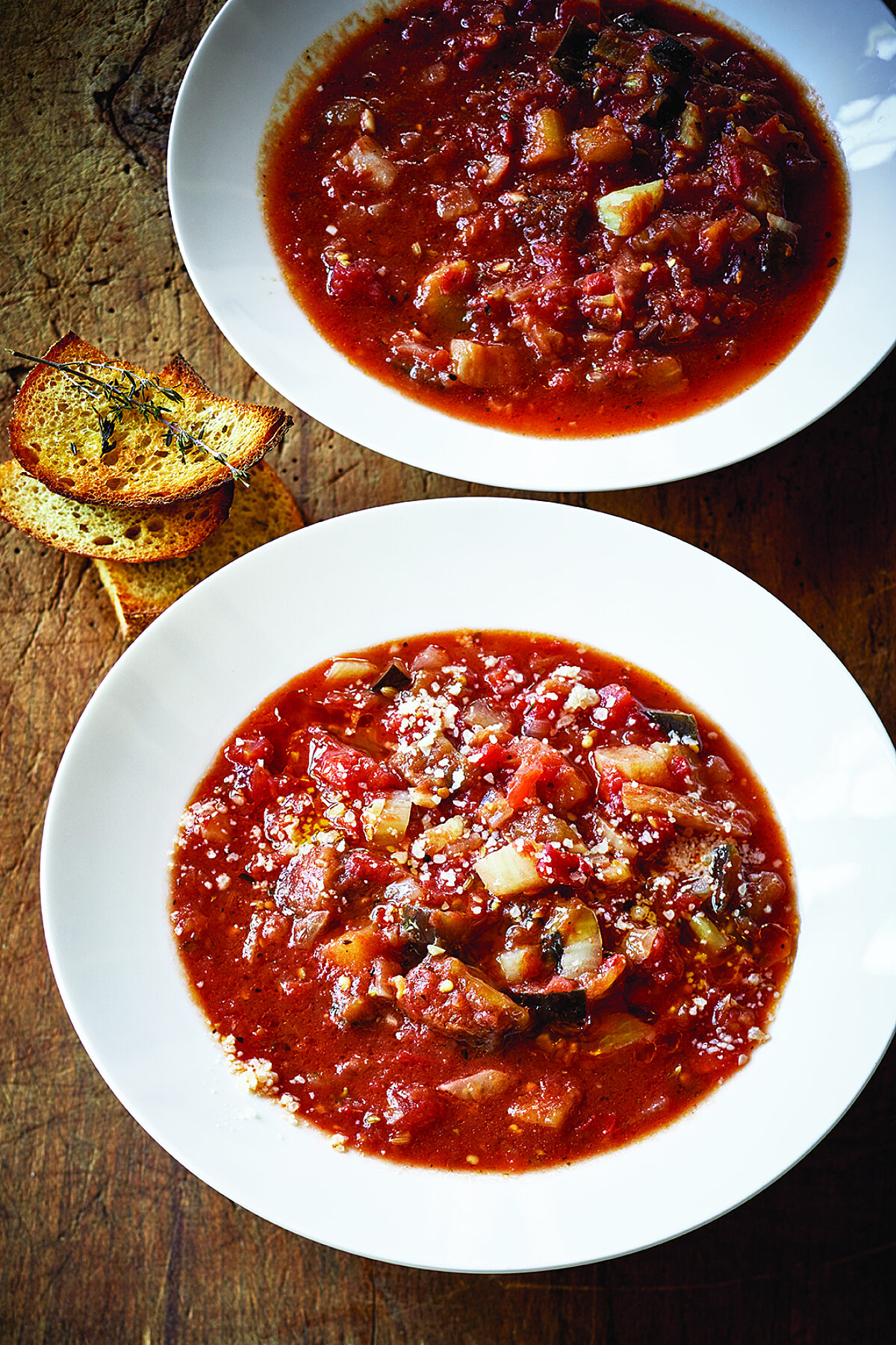 I love a nice two-fer. I make a big batch of something and use the leftovers to make a second, completely different recipe the next day. This Tomato & Eggplant Soup is a hearty winter lunch, and I use the leftover soup as a sauce for delicious Baked Pasta with Tomatoes & Eggplant. No one will even know they’re eating leftovers!!!