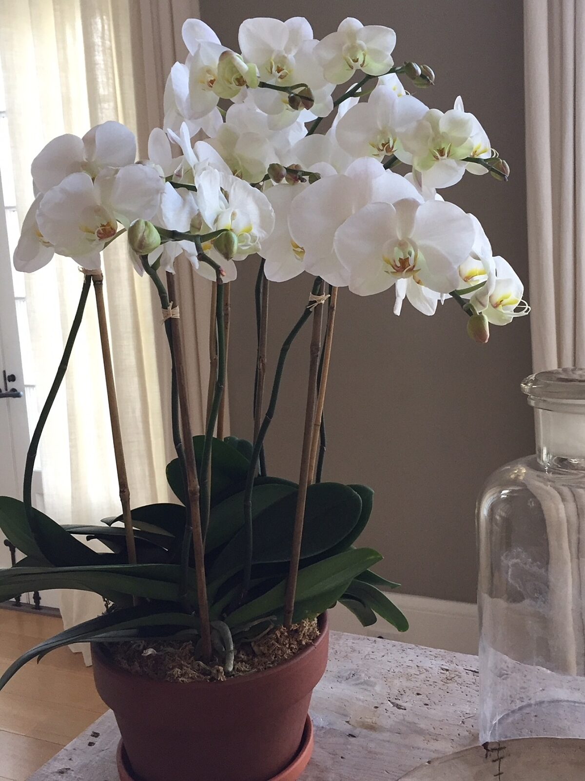 A beautiful orchid may be a little expensive to buy, but it blooms for three to four months and gets more and more beautiful as the flowers unfurl. And if you have room to store it, an orchid will bloom again for you for years to come. Flowers really do make any room feel special, and I especially love this one at the end of my long work table in the barn.