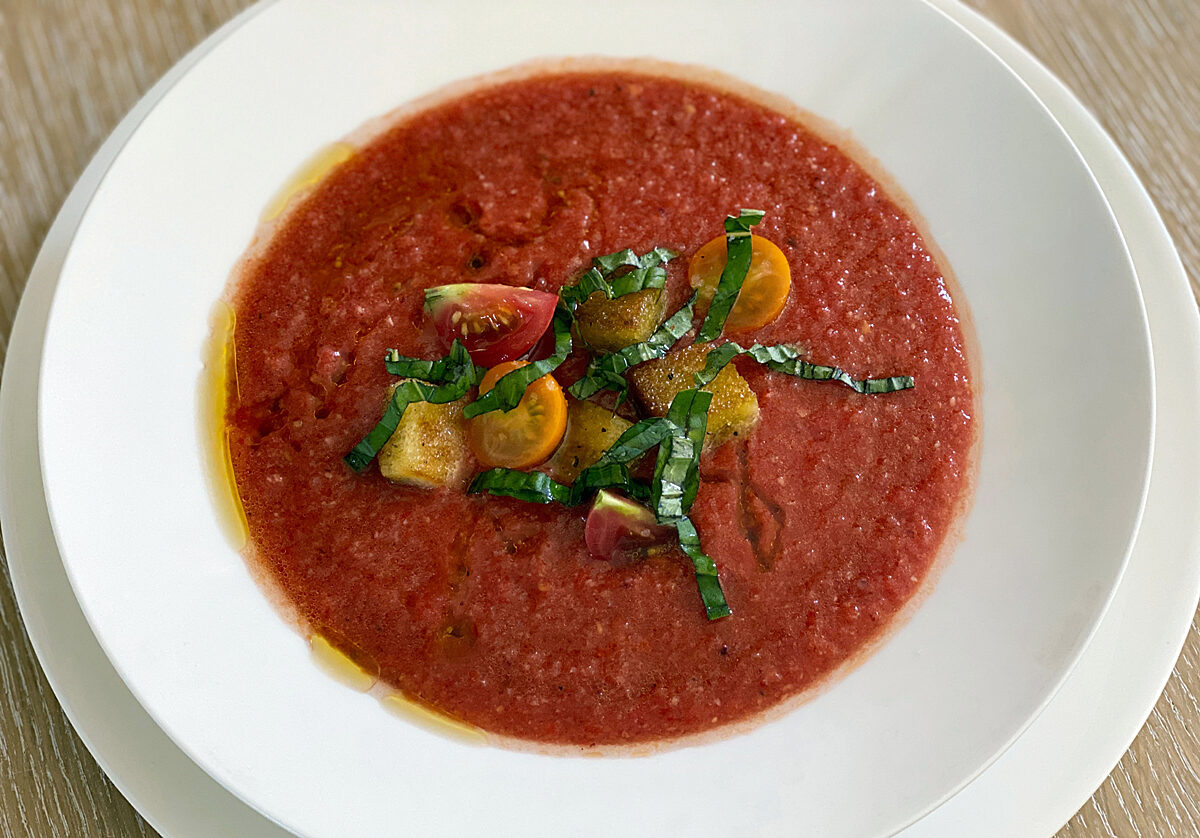 It’s the height of tomato season and this Salmorejo from my new book, Modern Comfort Food, is the perfect way to use all those delicious ripe tomatoes from the farm stand. It’s like gazpacho, but it’s pureed with bread to thicken it a little. The best part is that it’s right from the farm stand to your dinner table with no cooking at all, unless you count toasting the croutons as cooking! Modern Comfort Food is available October 6th but you can pre-order the book here or wherever books are sold.