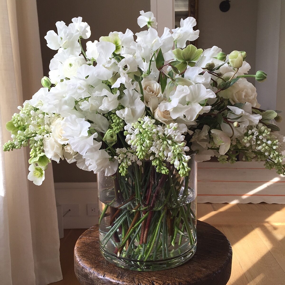 Spring is just around the corner but in the meantime, I love to get a head start and fill the house with flowers. Putting together beautiful arrangements of multicolored flowers can be hard, because I have trouble balancing the colors and textures of all the flowers, so I’ve always found it much easier to stick to one color and use lots of varieties of flowers. A dear friend of mine sent me this amazing arrangement and it’s my dream bouquet – all-white sweet peas, ranunculus, lilacs, and hellebores, with a few green leaves that set off the white flowers beautifully. The temperatures may still be chilly outside, but inside Spring is in full bloom!