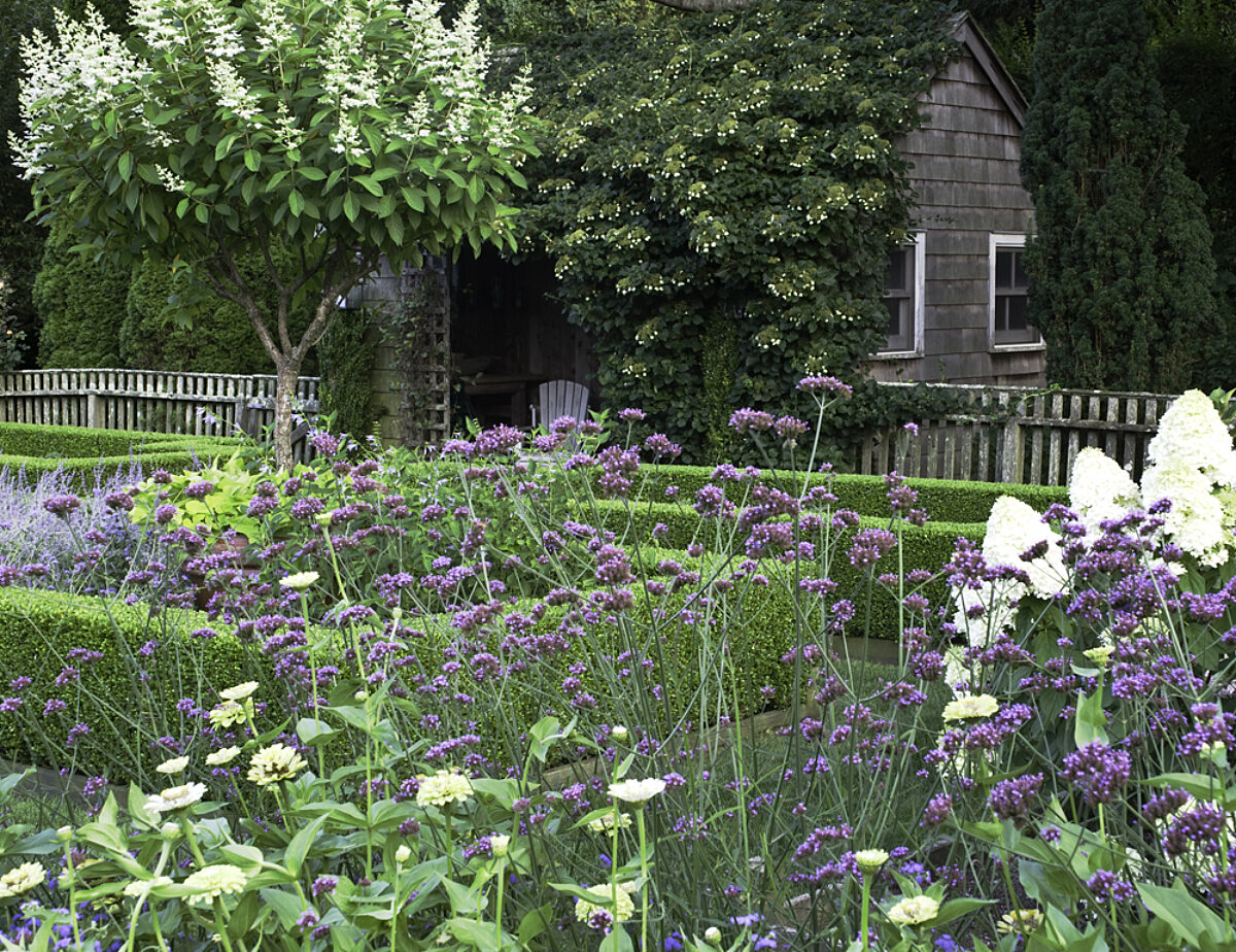 I love the garden in late summer when everything is going crazy! I plant a combination of perennials and annuals inside the boxwood squares, and the mix of colors - the lime green and white zinnias, purple salvias, purple Russian sage, and purple verbena bonariensis- is just gorgeous in August.