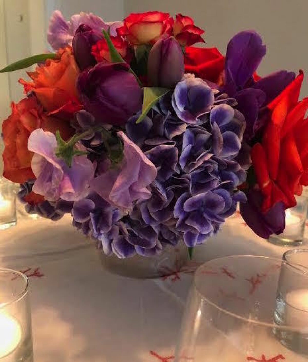 Just because it's Valentine's Day doesn't mean everything has to be red and white! I love orange and purple together, so for the flowers for my Valentine's Day dinner tonight, I did a mix of orange roses, lavender hydrangeas, and purple tulips. They look great with the little orange details in the tablecloth. Happy Valentine's Day everyone! Kiss someone you love!