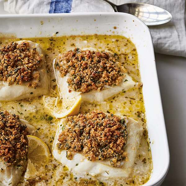 Remove the fish from the oven and pour the wine and lemon juice directly on the fillets. Pat the crumb mixture evenly onto the fillets, pressing gently to help them adhere. (Don't worry if some crumbs get into the sauce!)
