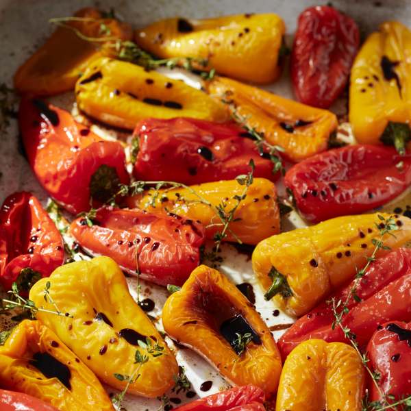 While still hot, drizzle the peppers with 3 tablespoons of balsamic vinegar and season to taste. Serve warm or at room temperature.