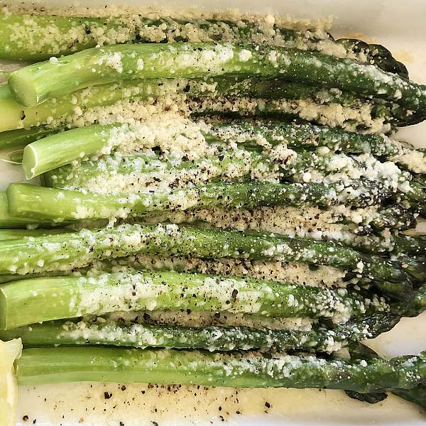 Transfer the asparagus to a 10 x 12-inch rectangular baking dish. Add the butter, 1 teaspoon salt and ½ teaspoon pepper and toss to coat the asparagus. Arrange the asparagus decoratively in the dish, sprinkle with the Pecorino and Parmesan, and roast for 5 minutes, until the cheese melts. Squeeze on some lemon juice, sprinkle with fleur de sel, and serve hot.