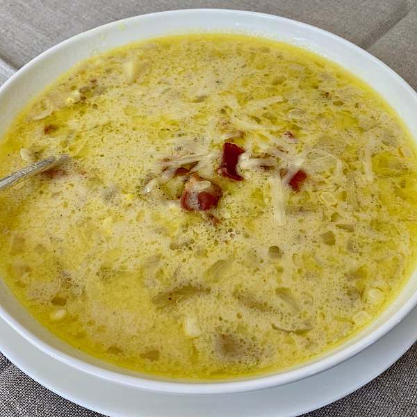 Stir in the flour, salt, pepper, and turmeric and cook for 3 minutes. Add the chicken stock and potatoes, bring to a boil, and simmer uncovered for 15 minutes, until the potatoes are tender. If using fresh corn, cut the kernels off the cobs and blanch the kernels for 3 minutes in boiling salted water. Drain. (If using frozen corn, you can skip this step.) Add the corn to the soup, then add the half-and-half and Cheddar. Cook for 5 more minutes, until the cheese is melted. Season to taste with salt and pepper. Serve hot with a garnish of bacon.