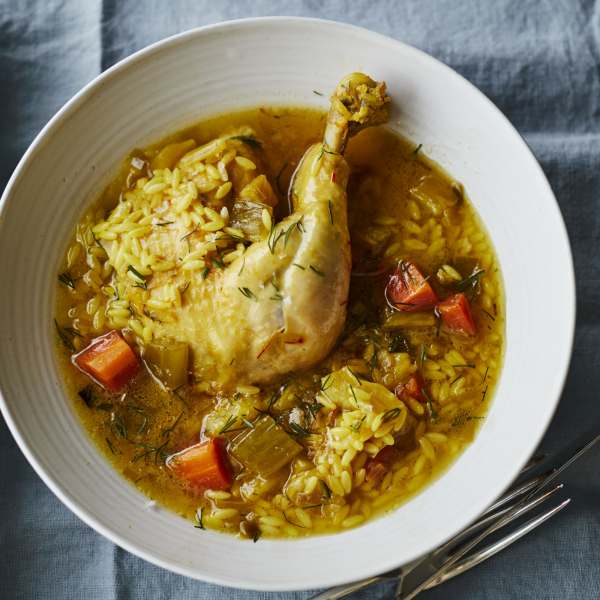 Discard the herb bundle, stir the orzo into the broth, cover, and allow to sit off the heat for 20 to 25 minutes, until the orzo is tender. Using forks to separate the chicken into quarters, carefully pull the breast meat away from the bones (I leave the bones in the leg portion) and reheat, if necessary. Spoon some of the chicken, broth, and pasta into large shallow bowls, and serve hot sprinkled generously with minced dill and salt.
