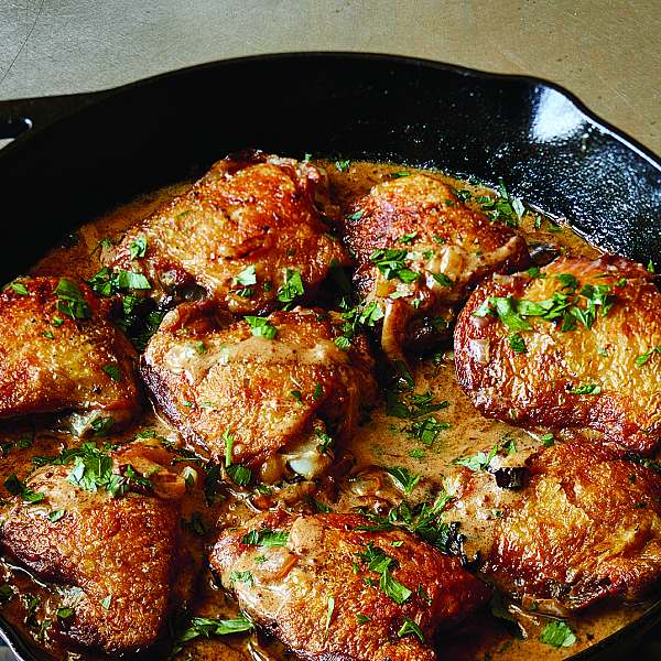 Heat 1 tablespoon olive oil in a large (11 to 12-inch) cast-iron skillet over medium heat. When the oil is hot, place the chicken in the pan in one layer, skin side down. Cook over medium heat for 15 minutes without moving, until the skin is golden brown. (If the skin gets too dark, turn the heat to medium low.) Turn the chicken pieces with tongs, add the onions to the pan, including under the chicken, and cook over medium heat for 15 minutes, stirring the onions occasionally, until the thighs are cooked to 155 to 160 degrees and the onions are browned. Transfer the chicken (not the onions) to a plate and allow to rest uncovered while you make the sauce. If the onions aren’t browned, cook them for another minute.