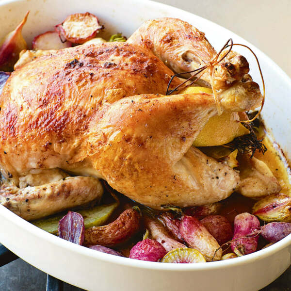 Roast for 1 hour and 15 minutes, until the juices run clear when you cut between the leg and thigh. Cover the pan or baking dish with aluminum foil and allow to sit at room temperature for 15 minutes. Carve the chicken and serve with the radishes and pan juices.