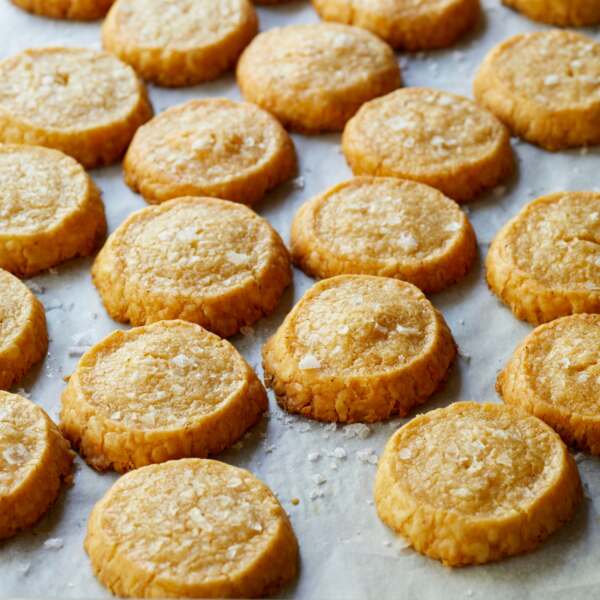 Line two sheet pans with parchment paper. Slice the dough ½ inch thick and place the rounds 1 inch apart on the parchment paper. Sprinkle with sea salt and bake for 15 to 17 minutes, until golden brown. Cool on the sheet pans or a baking rack and serve at room temperature.
