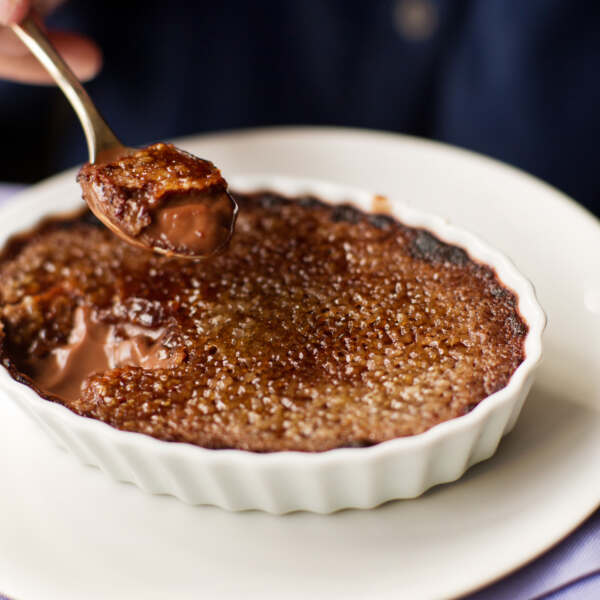 To serve, spread 1 tablespoon of sugar evenly on each custard. With a kitchen blowtorch held one inch from the surface of the crème, heat the sugar until it caramelizes evenly. Allow to cool for 5 minutes and serve.