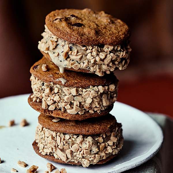 Put the toffee bits on a small plate and, working quickly, roll the edge of each sandwich in the toffee bits, using your hand to fill in the spaces with extra toffee. Immediately, place the sandwiches in the freezer and freeze until firm. Wrap well and keep frozen until ready to serve.