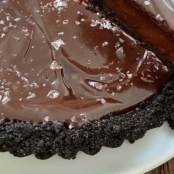 For the glaze, put the ½ cup chocolate and the coffee in a glass bowl. Heat the cream to simmering and pour it over the chocolate. Let sit for 1 minute, then whisk until smooth. Gently pour over the chocolate filling (not the crust) and spread to the inside edge of the crust with a knife or offset spatula. Sprinkle with the salt and set aside at room temperature until set. Remove the rim of the tart pan and place the tart on a flat serving plate. Cut in wedges (don’t worry if the crust crumbles) and serve at room temperature.