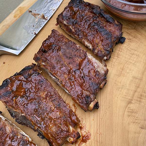 About 40 minutes before you want to serve, heat a charcoal grill with a layer of hot coals or heat a gas grill to medium-high heat. After the charcoal turns gray, brush the cooking grate with oil to keep the ribs from sticking. Place the ribs on the grill ribs-side-down, put the lid on top (be sure both vents are open!), and grill for 5 minutes. Turn the ribs meat-side-down, put the lid back on, and grill for another 4 to 5 minutes, until nicely browned. Place on a cutting board, cover tightly with aluminum foil, and allow the ribs to rest for 10 minutes. Cut into ribs and serve hot with extra barbecue sauce on the side.