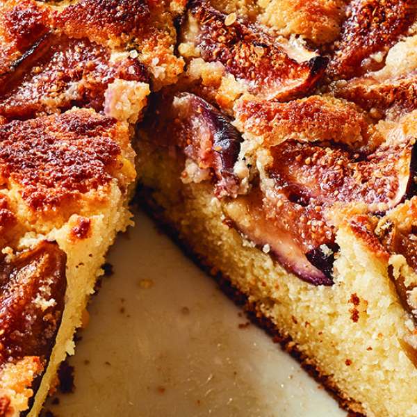 In a small bowl, sift together the flour, baking powder, and salt. With the mixer on low, slowly add the dry ingredients to the batter, mixing just until combined. Pour the batter into the prepared pan and smooth the top. Arrange the figs on the cake, cut sides up, in snug but not -overlapping concentric circles. Sprinkle with the turbindo sugar and bake for 35 to 45 minutes, until the top is lightly browned and a toothpick inserted in the center comes out clean.