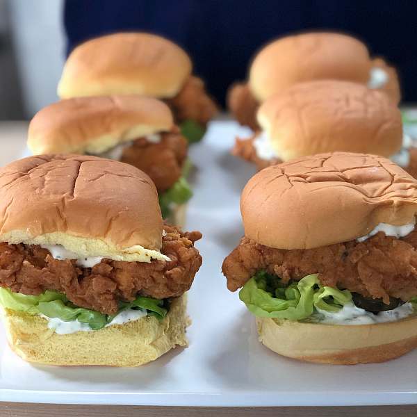 To assemble, place the bottom of each bun on a plate, spread with some of the Buttermilk Herb Mayo, then a lettuce leaf, 4 pickle slices, then a piece of chicken. Spread the underside of the top bun generously with more of the mayo and place on top of the chicken, mayo side down. Serve while the chicken is still warm.