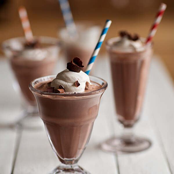 Place ¾ cup of the milk, 2 tablespoons of the coffee liqueur, ½ teaspoon of the vanilla, and half of the chocolate mixture in a blender. Add 2 cups of the ice and blend for several minutes, until the mixture is thick but not icy, like a frozen daiquiri. (You can add a little more milk or ice if it’s too thick or too thin.) Pour into two (10-ounce) ice cream soda glasses and top each with a generous dollop of whipped cream and some grated chocolate. Repeat for the second two glasses. Serve ice cold with straws and long-handled spoons.