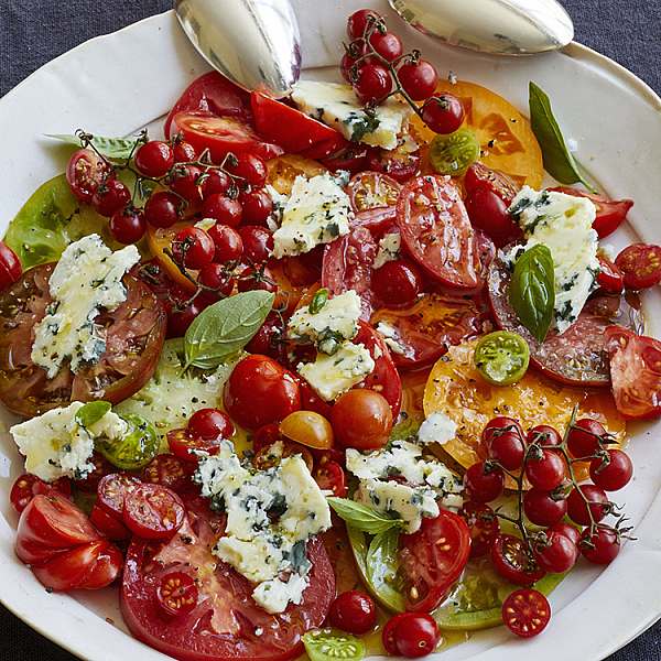 Slice the large tomatoes and arrange them on a platter. Cut the cherry tomatoes in half through the stem and arrange with the tomatoes. Sprinkle generously with salt and drizzle with vinegar. Set aside for 5 minutes.