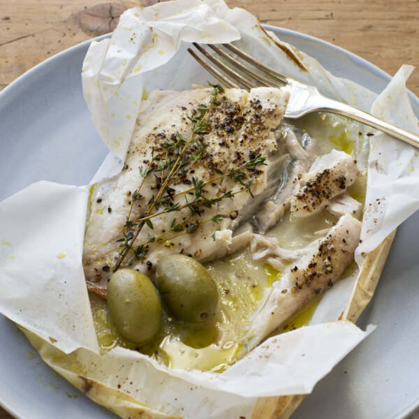 Place the pieces of parchment paper on a flat surface, fold them in half crosswise, and cut each piece like a large paper heart cutout. Open the fold flat and place each fillet lengthwise just to the right of the fold. On each fillet, sprinkle ½ teaspoon salt, ¼ teaspoon pepper, 1 tablespoon olive oil, 1 tablespoon lemon juice, and 2 sprigs of thyme, and place 2 olives alongside the fish.