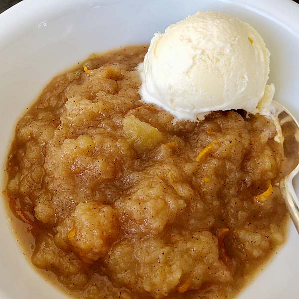 Place the zest and juice of the oranges and lemon in a large bowl. Peel, quarter, and core the apples and toss them in the juice. Pour the apples and juice into a nonreactive Dutch oven or enameled iron pot. Add the brown sugar, butter, cinnamon, and allspice and cover the pot. Bake for 1 1/2 hours, or until all the apples are soft. Mix with a whisk until smooth. Serve warm or at room temperature with a scoop of vanilla ice cream.