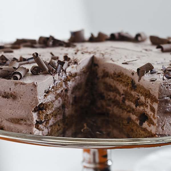 To assemble the cake, arrange chocolate chip cookies flat in an 8-inch springform pan, covering the bottom as much as possible. (I break some cookies to fill in the spaces.) Spread a fifth of the mocha whipped cream evenly over the cookies. Place another layer of cookies on top, lying flat and touching, followed by another fifth of the cream. Continue layering cookies and cream until there are 5 layers of each, ending with a layer of cream. Smooth the top, cover with plastic wrap, and refrigerate overnight.