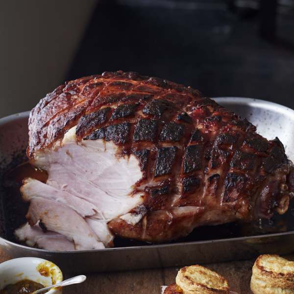 Spoon two thirds of the glaze over the ham. Raise the oven temperature to 325 degrees. Bake the ham for one hour, basting occasionally with the remaining glaze, until golden brown. Allow to rest for 15 minutes, slice, and serve hot or warm with the chutney and, if desired, with the biscuits.