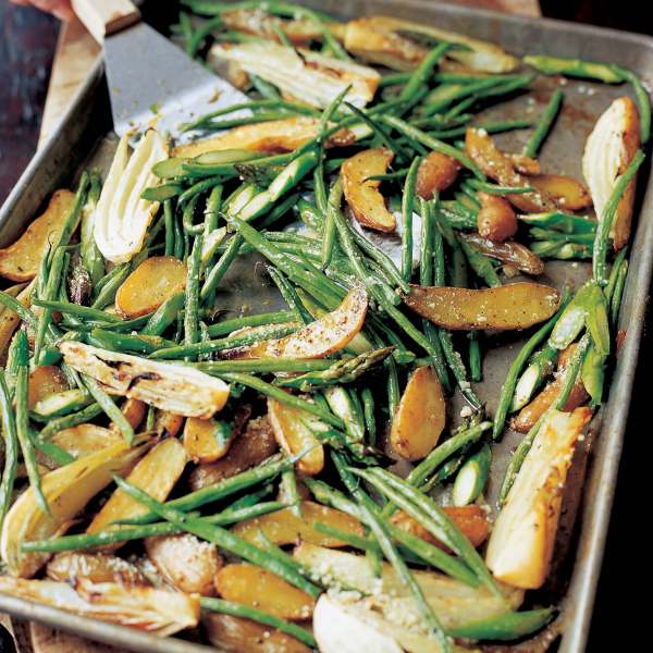 Roast the vegetables for 25 to 30 minutes, until the potatoes are tender, tossing once while cooking. Toss the string beans and asparagus with the roasted vegetables and roast for another 10 to 15 minutes, until the green vegetables are tender. Sprinkle on the Parmesan cheese and roast for another minute or two until the cheese melts.