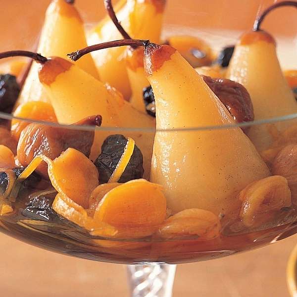 Chill the pears, dried fruit, zests, and poaching liquid. Remove the cinnamon, cloves, and vanilla before serving if you like.
