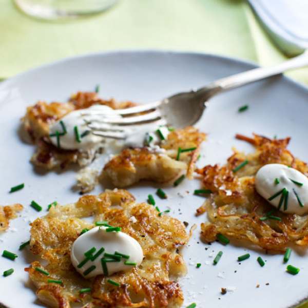 Heat 2 tablespoons of butter with 1 tablespoon of olive oil in a large (12-inch) sauté pan over medium-high heat, until sizzling. Drop heaping tablespoons of the potato mixture into the skillet (you want them to be messy). Flatten the pancakes lightly with a metal spatula and cook for 2 to 3 minutes on each side, until browned. Continue adding butter and oil, as needed, to fry the remaining batter. Serve hot with sour cream and chives.