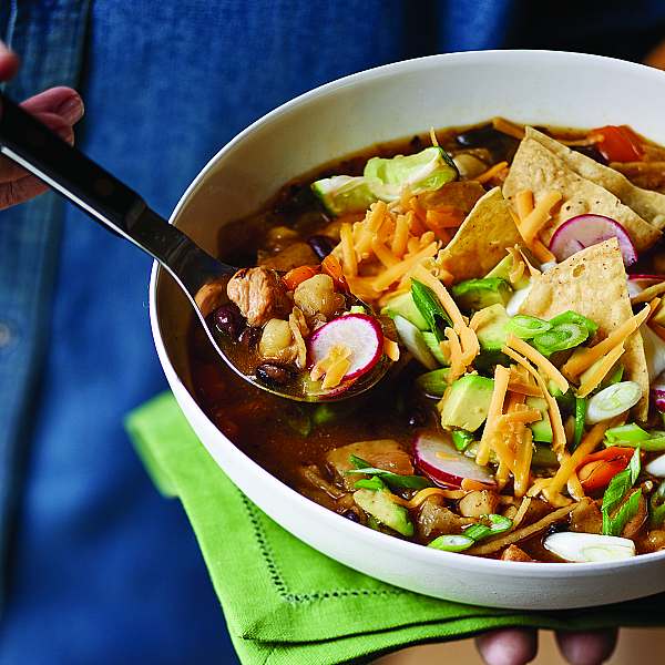 To serve, ladle the posole into large soup bowls. Garnish with a squeeze of lime and top with avocado, scallions, radishes, tortilla chips, Cheddar, and sour cream. Serve hot.