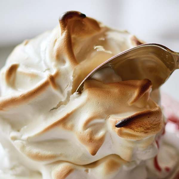 Transfer the cake rounds and ice cream to a sheet pan lined with parchment paper. Working quickly, spread the meringue with a spoon or small spatula, making lots of peaks all over with the back of the spoon. (You can also use a pastry bag fitted with a large fluted tip and pipe the meringue thickly around each ball of ice cream and cake.) Be sure all of the ice cream is covered with meringue. Bake for 2½ to 3 minutes, until the edges of the meringues are browned, turning the pan once to brown evenly. Transfer to dessert plates, drizzle fresh raspberry sauce around each baked Alaska, and serve immediately.