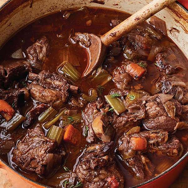 Remove the short ribs to a plate with a slotted spoon and discard the thyme bundle and any bones that have separated from the meat. Simmer the sauce on the stove for 20 minutes, until reduced. Skim some of the fat off the top and discard. Return the ribs to the pot, heat for 5 minutes, and taste for seasonings. Serve hot with Creamy Parmesan Polenta or Emily's English Roasted Potatoes.