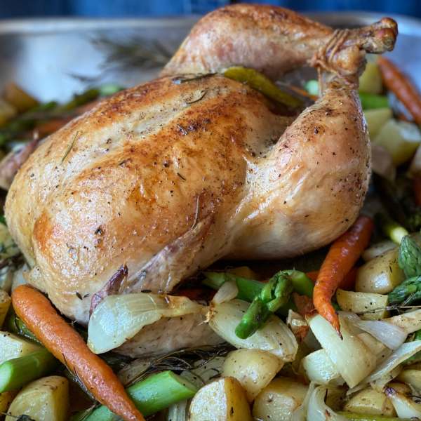 Meanwhile, add the asparagus to the pan, tossing them with the other vegetables. Roast for 10 to 12 minutes, until the asparagus are crisp-tender. Discard the herb branches, carve the chicken, and serve with the vegetables and pan juices.