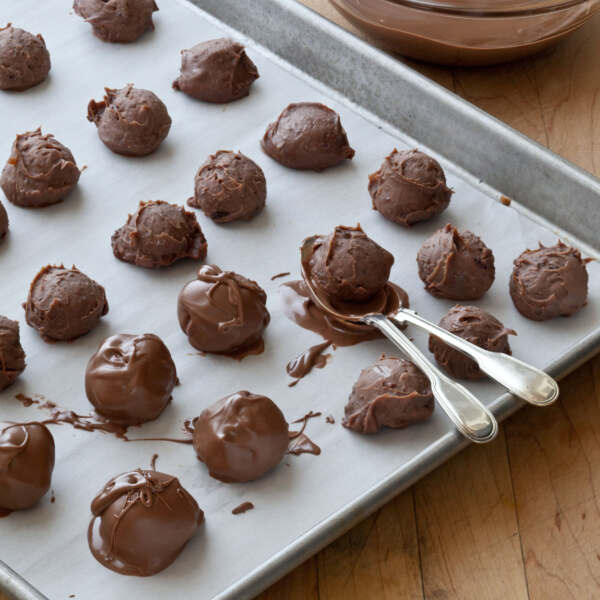 The next day, using a very small (1¼-inch) ice cream scoop (you can also use 2 spoons), scoop balls of the mixture onto sheet pans lined with parchment paper. Refrigerate for at least 30 minutes.