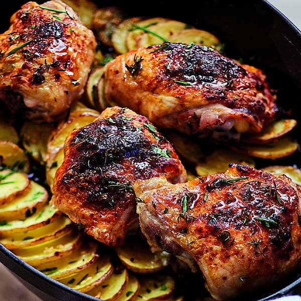 Using tongs, transfer the chicken to a plate and put the potatoes, garlic, 1 teaspoon salt, and ½ teaspoon pepper into the skillet. Toss to coat with the pan juices then spread the potatoes out. Return the chicken to the skillet, placing it on the potatoes. Roast 30 minutes longer, until the chicken registers 155 degrees on an instant-read thermometer. Transfer just the chicken to a plate and cover loosely with aluminum foil to keep warm. Return the skillet to the oven, raise the temperature to 425 degrees, and roast the potatoes for 15 minutes, until they’re tender and starting to brown. Return the chicken to the pan and sprinkle with the parsley, chives, and extra salt. Serve hot from the skillet.