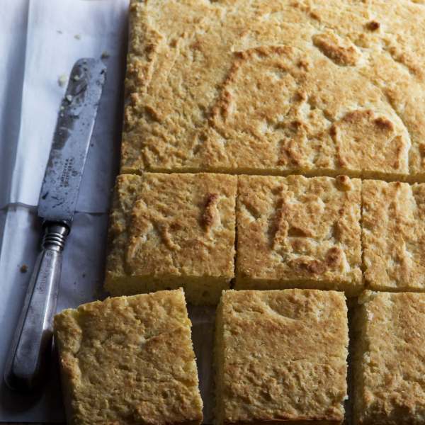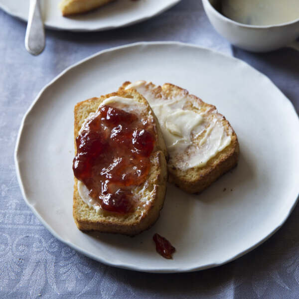 When ready to serve, slice the corn bread, toast it, and serve with salted butter and strawberry jam.