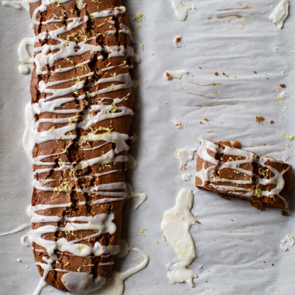 Turn the dough out onto a very lightly floured board, form it into a disk with lightly floured hands, and cut it in half. Roll each half into a log 12 inches long and place them 3 inches apart on the prepared sheet pan. Bake for 20 minutes; the logs will still be soft in the center.