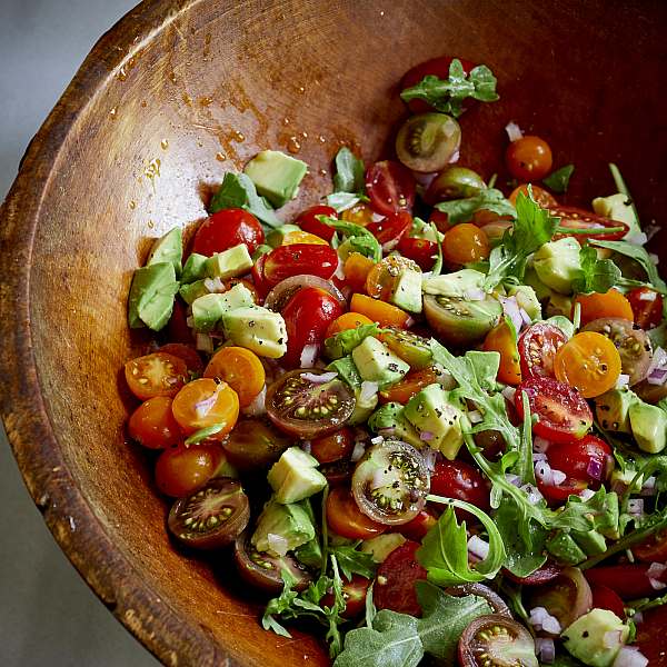 Pour enough of the vinaigrette over the tomato and avocado mixture to moisten completely. Add the arugula, add more vinaigrette, sprinkle with 1½ teaspoons salt and ½ teaspoon pepper, and toss well. Taste for seasonings (you want the salad well seasoned!) and serve at room temperature.