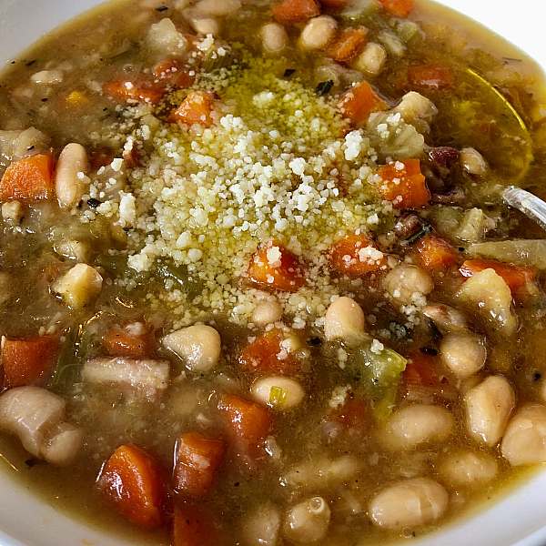Reheat slowly, ladle into large shallow soup bowls, sprinkle with Parmesan cheese, drizzle with olive oil, and serve hot.