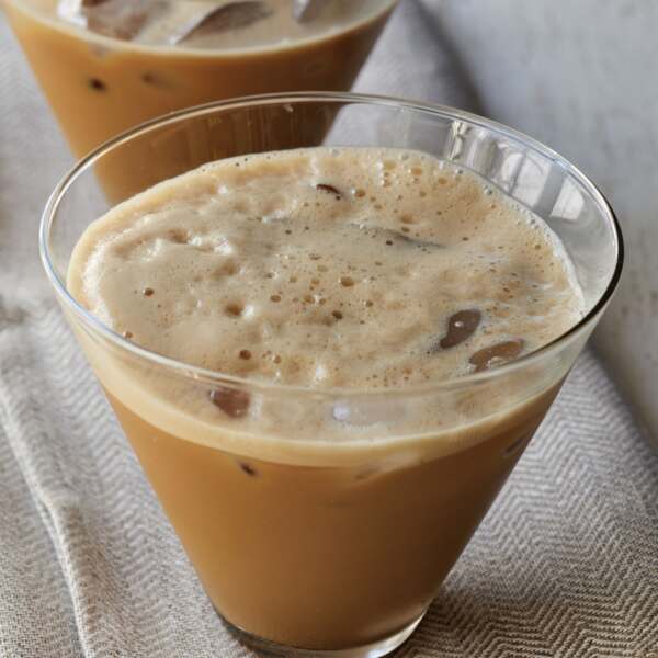 In a large cocktail shaker, stir together the espresso, condensed milk, simple syrup, and vanilla. Add the ice and shake for a full 30 seconds, until frothy and very cold. Pour the drink and the ice into two 8-ounce glasses and serve ice cold.