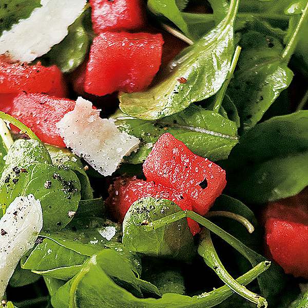 With a very sharp knife or a vegetable peeler, shave the Parmesan into large shards and sprinkle them on the arugula and watermelon. Sprinkle with salt and serve.